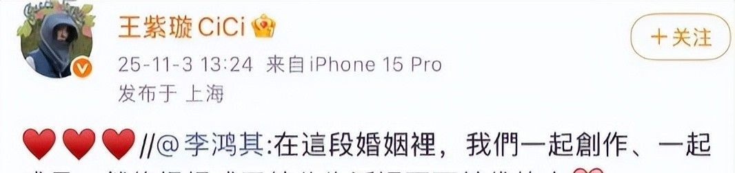 同年11月3日,他们通过杂志封面官宣婚讯。李鸿其撰写长文回忆点滴:“我们一起成长,一起面对风雨。”王紫璇转发回应,配图是两人依偎相视的照片,眼神交汇之处,尽是笃定。