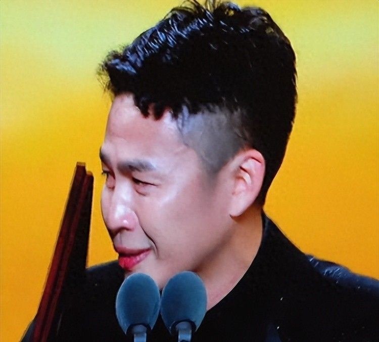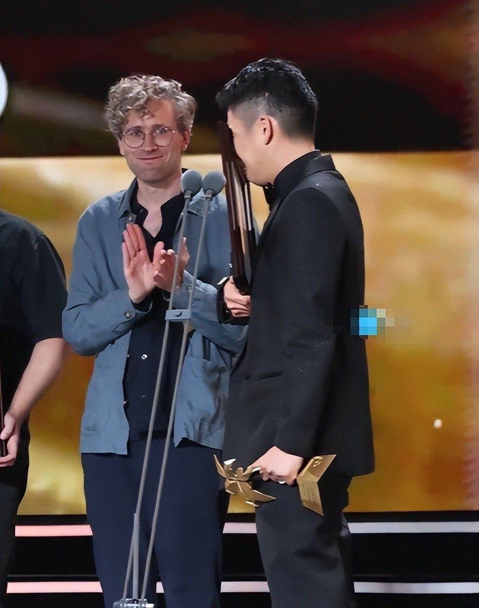 站在领奖台上的他,身穿一套线条利落的黑色西装,发丝略显凌乱,仿佛刚从剪辑室直奔现场。接过奖杯时,他深深吸气,眼眶已然泛红,声音微微发颤:“拍电影很难,但她一直都在。”