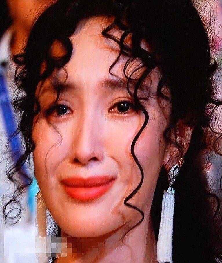 她双手交握置于膝上,嘴角扬起温柔弧度,却又频频抬手轻拭眼角,神情里交织着欣慰与心疼。精心打理的卷刘海贴合脸型,衬得五官愈发清秀动人。